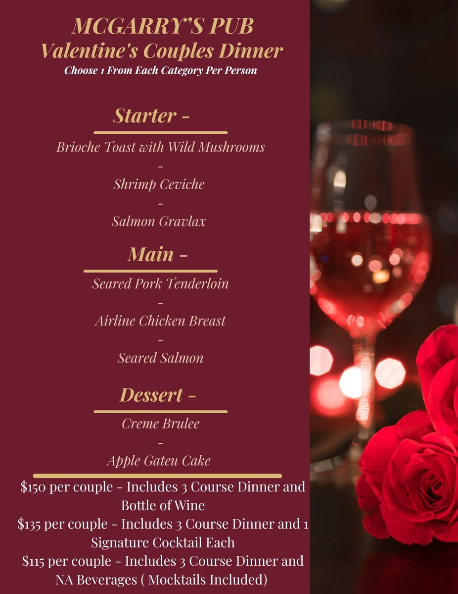 $135 per couple - Includes 3 Course Dinner and 1 signature Cocktail Each