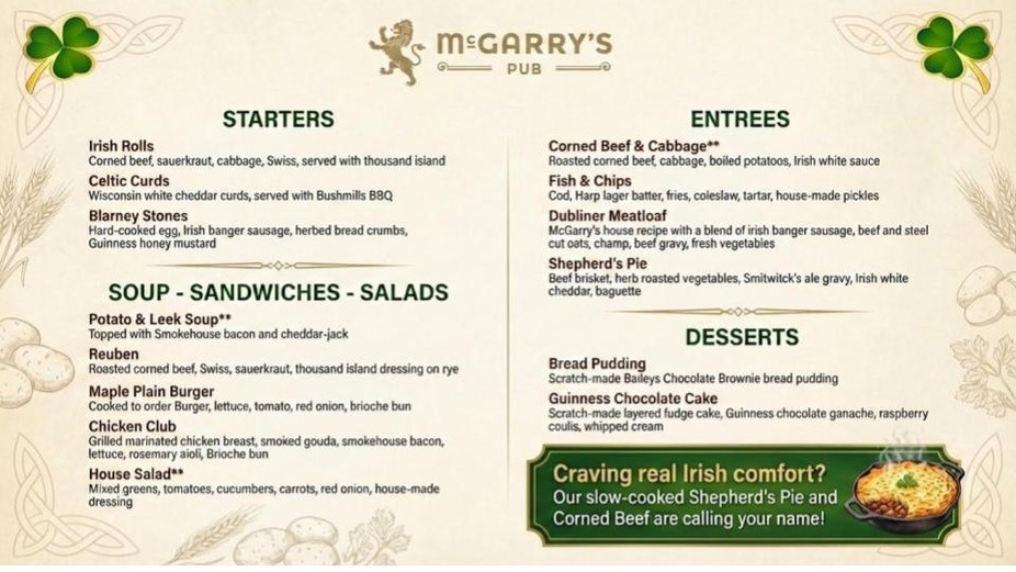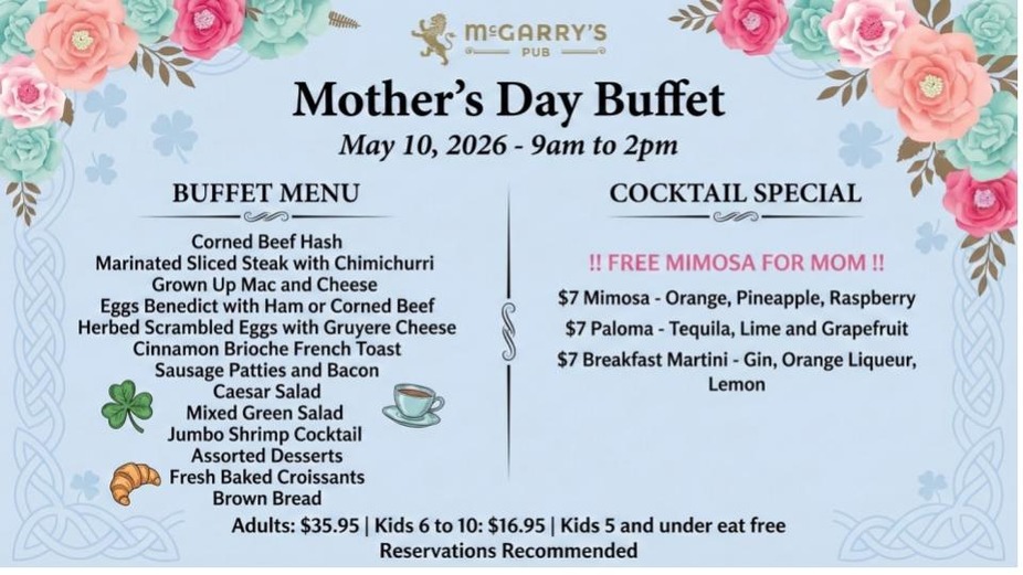 Hop on over for a festive Easter brunch! Enjoy traditional favorites with a side of Irish cheer. 🍀🐣"